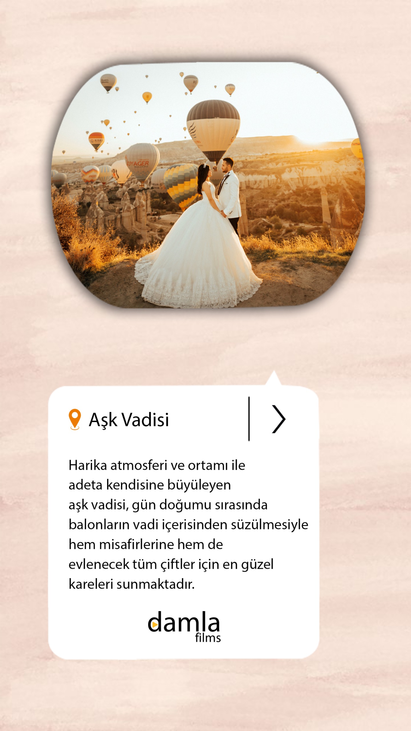 Bir mekan hayal edin.. İçerisinde tarihin en derinini, kapadokya dokusunun en güzelini barındırsın. Aşk Vadisi çevresinde kapadokya sıcak hava balonlarıı, romantik gün doğumu ve muhteşem enerjisi ile çiftlerimizin henüz çekime bile başlamadan büyülendiği bir konsepttir. Bu mekanda genel olarak gün doğumuna yakın saatlerde çekimler gerçekleştiriyoruz. Mekanın etkileyici atmosferi ve sıcak tonlardaki romantik dokusu ile birbirinden eşsiz fotoğraflar & videolara sahip olabilmektesiniz. Ayrıca mekanın geniş bir alan olması sebebiyle de oldukça etkileyici video sahnelerine ek olarak drone görüntüleride alınabilmektedir.