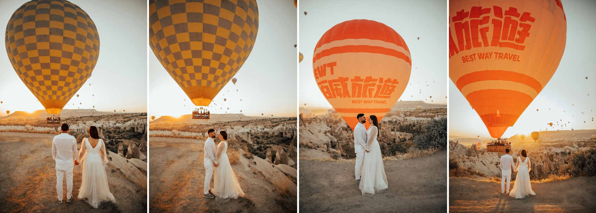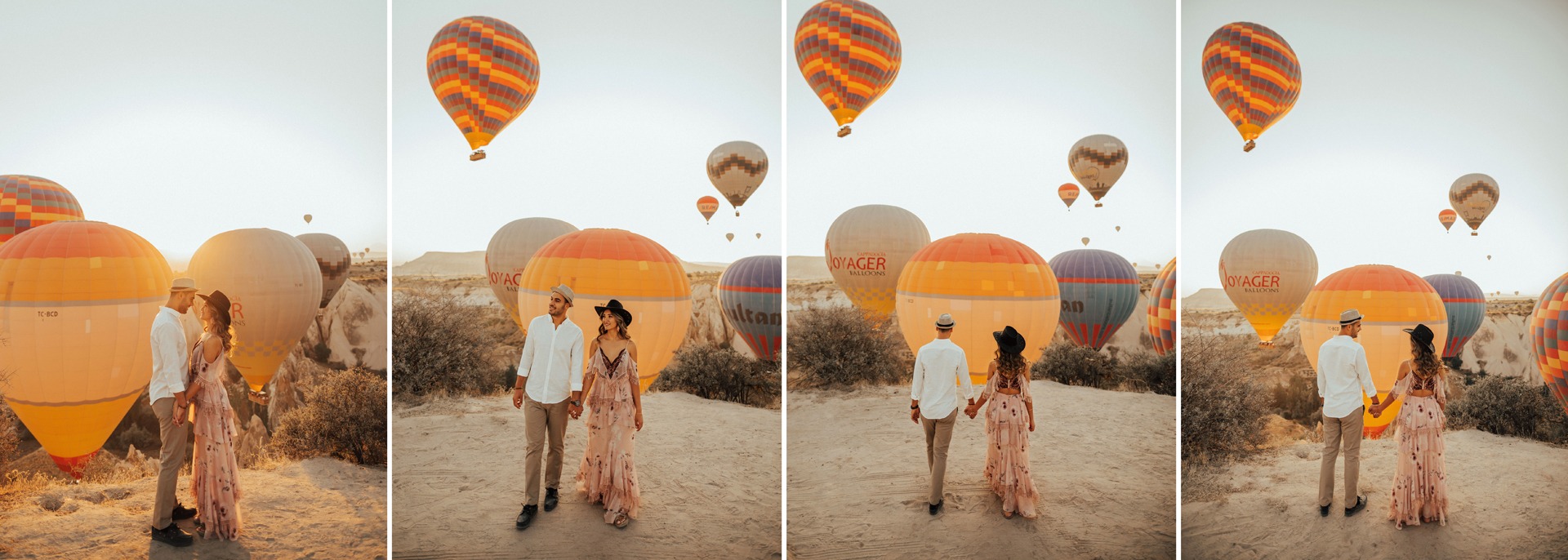 Çiftlerimizin hazırlıkları tamamlandıktan sonra balon kalkış alanında yaklaşık 30 dk çekim geerçekleştirmekteyiz. Ortalama 100-200 fotoğraf çektikten sonra yaklaşık 3-4 dakika mesafede bulunan Aşk Vadisi mekanına hareket edilmektedir. Vadi mekanındaki çekimler ise ışığın en yumuşak olduğu ‘Altın Saatler’ olarak tabir ettiğimiz gün doğumunda çekimlerimizi gerçekleştiriyoruz.